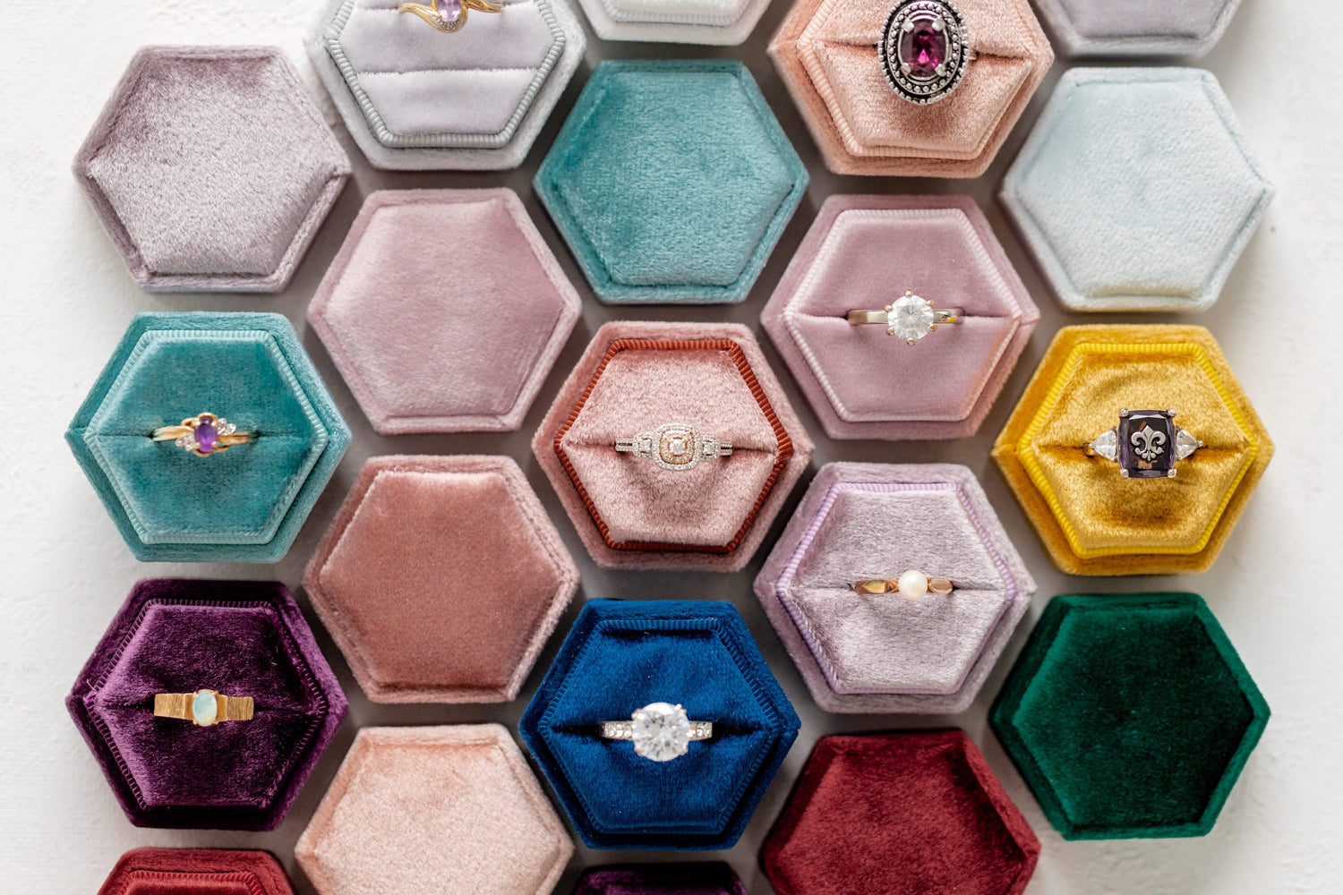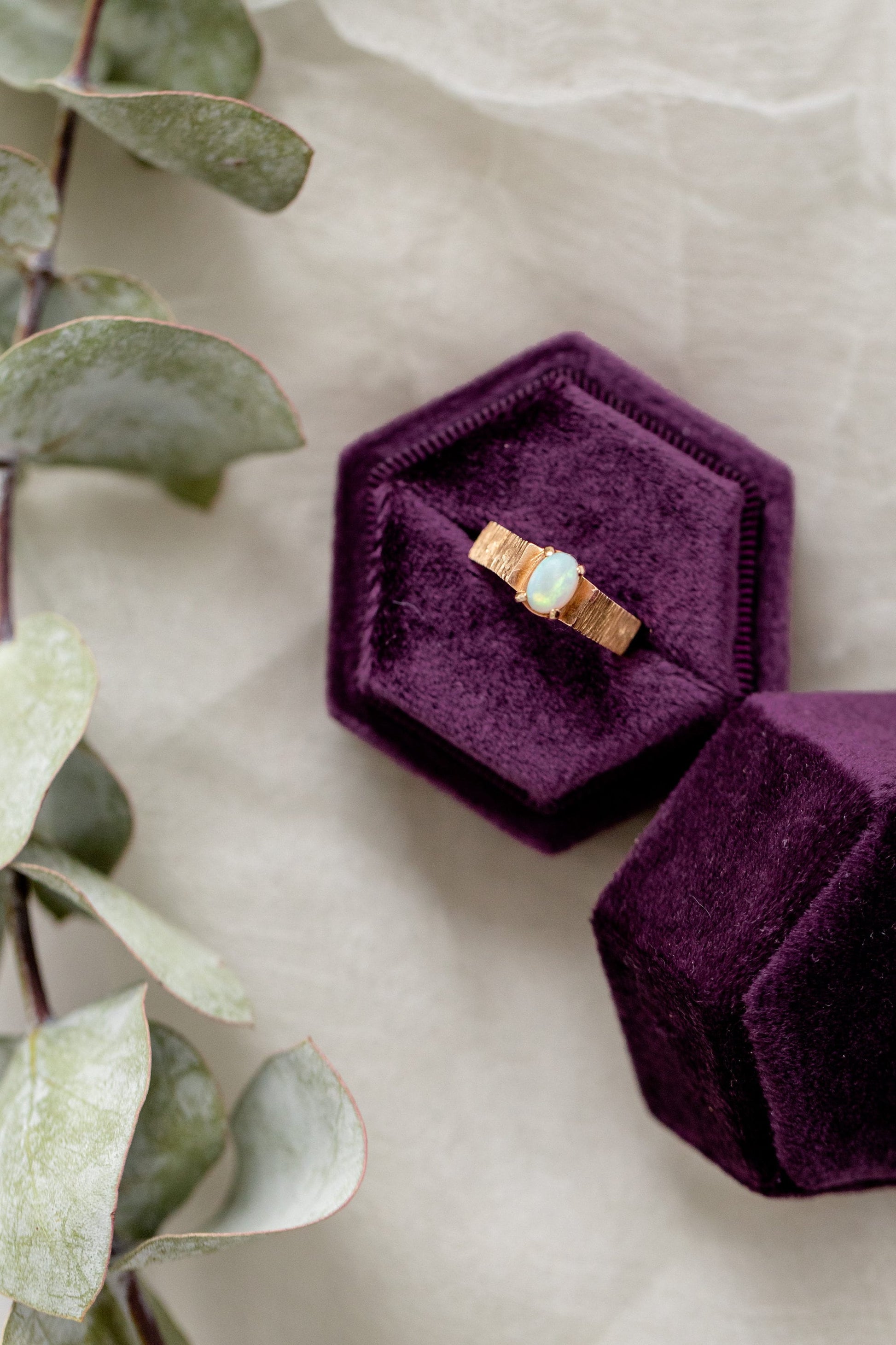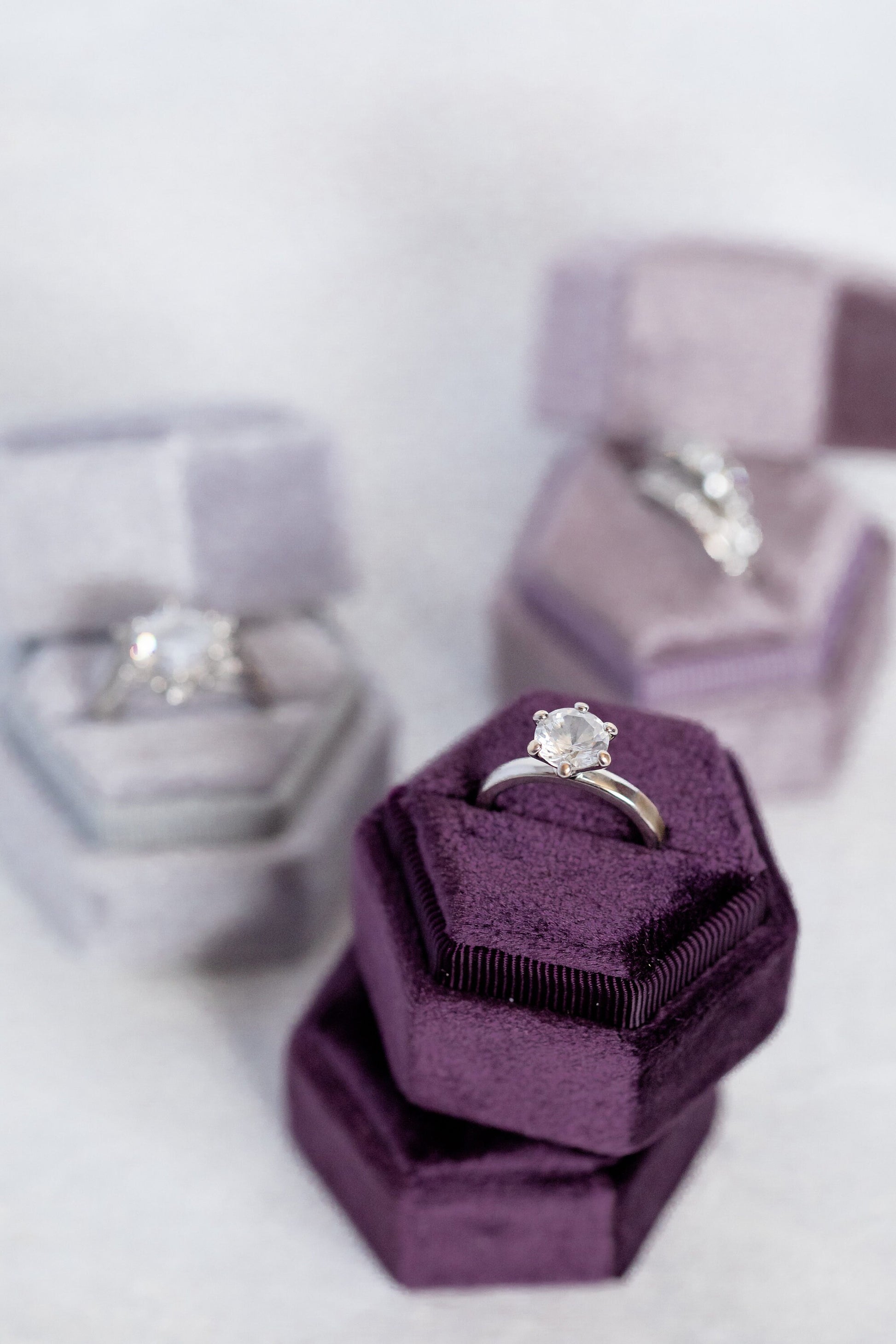 パープル六角ベルベット結婚指輪ボックス、ジュエリーリングボックス、婚約指輪ボックス、ブライダルギフトボックス